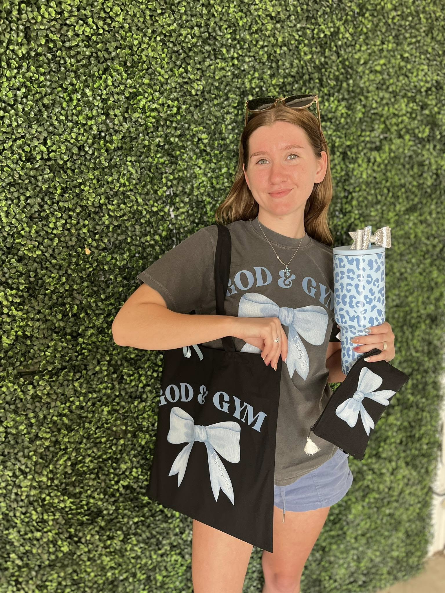 Bold faith meets fierce style in the God & Gym Blue Bow Collection. Whether you're headed to a workout, Bible study, or running errands, this set keeps your faith and fashion front and center.