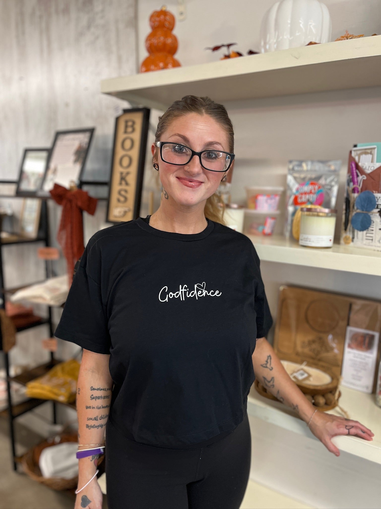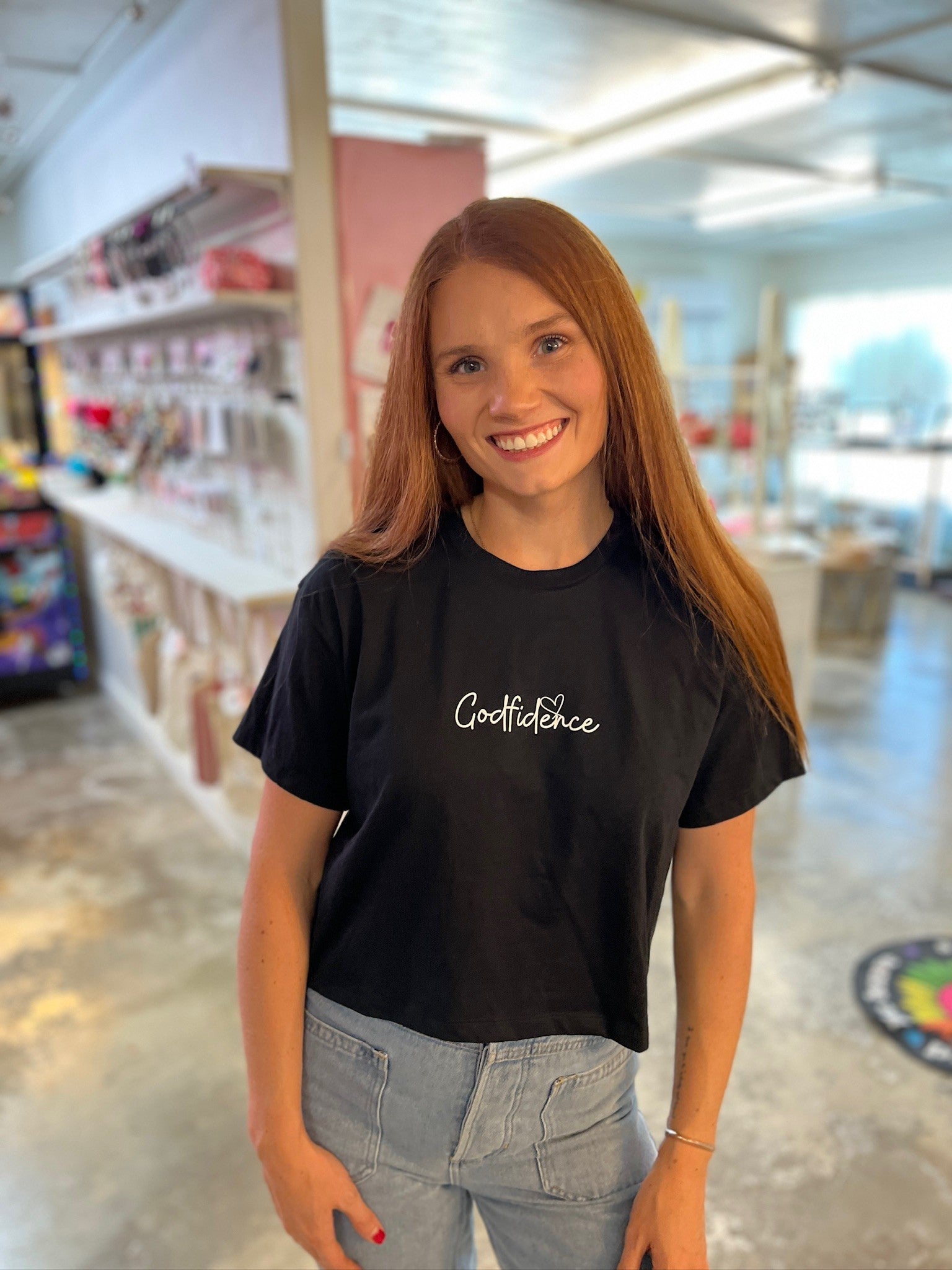 Step out in bold faith + southern charm with our Godfidence crop! This lightweight black tee is the perfect mix of comfy + cute, featuring a cropped fit that pairs effortlessly with your favorite jeans, skirts, or shorts. With “Godfidence” written across the front, it’s your daily reminder to walk with grace, strength, and the confidence only He provides.