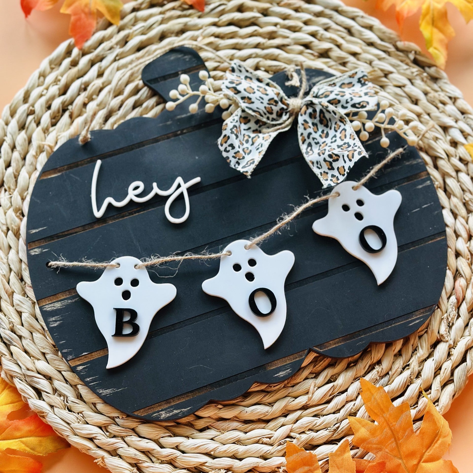 Welcome guests in seasonal style with this charming pumpkin-shaped door hanger—perfect for fall and Halloween! Measuring approximately 11.5" x 12.5", this piece combines rustic shiplap with playful 3D ghost accents for a warm yet festive touch.