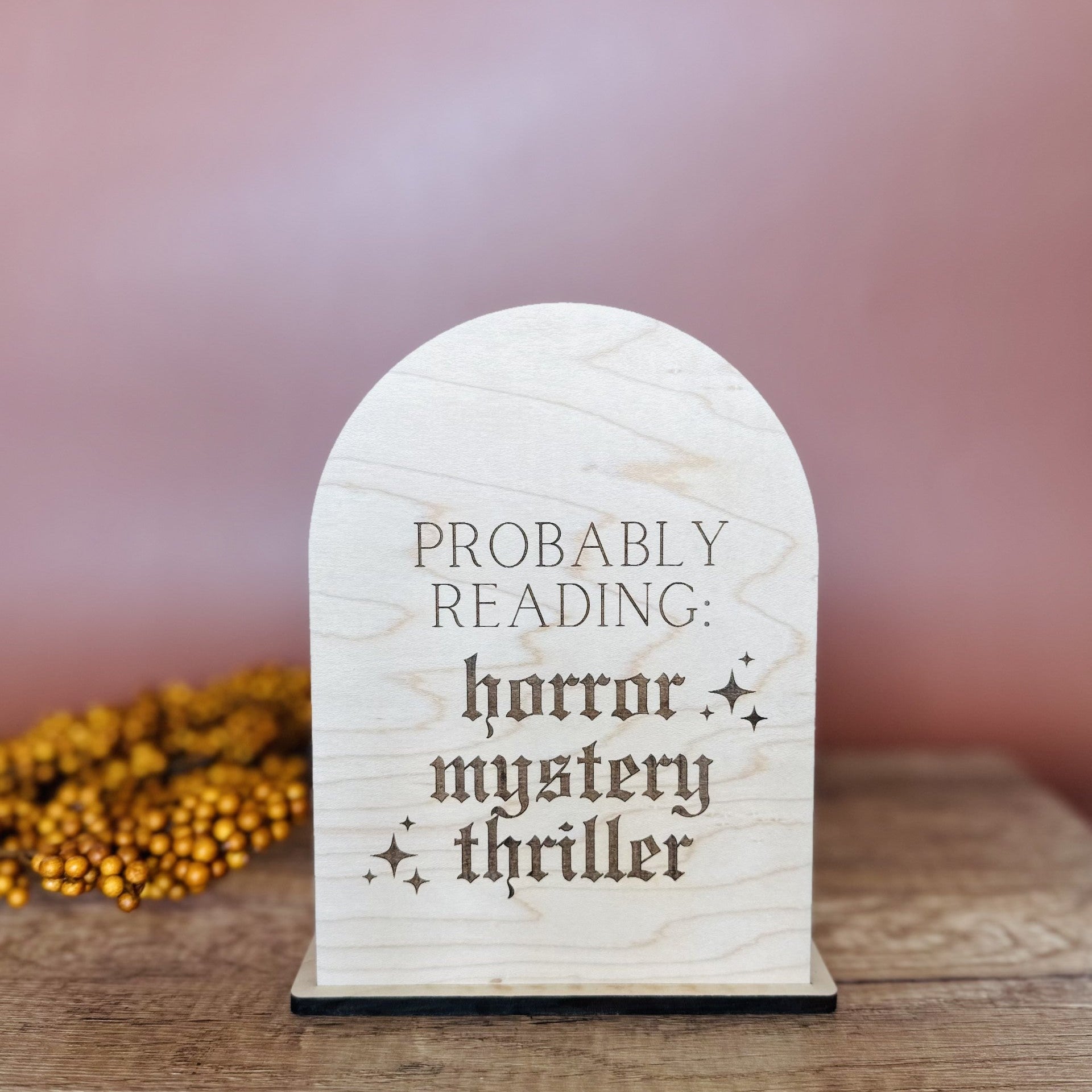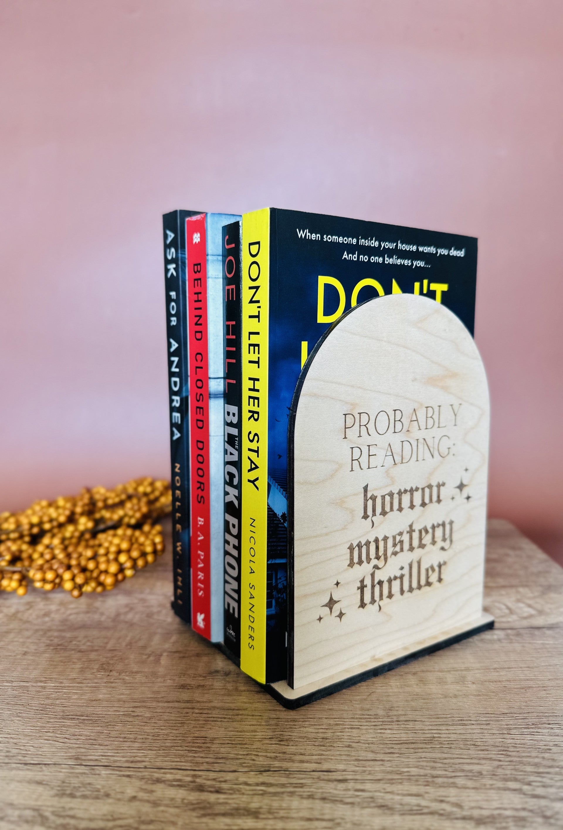 This book nook stand is the perfect companion for fans of chilling twists, eerie plots, and late-night page turners. Crafted from smooth, maple ply wood and engraved with gothic-style lettering (with a touch of sparkle, of course), this piece makes a bold and spooky-cute statement on any shelf or nightstand.