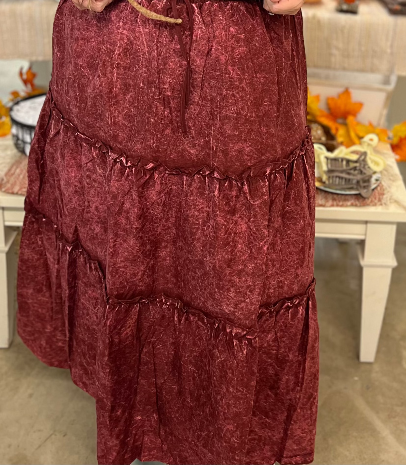 Rich in color and vintage charm, this dark rust tiered skirt is a standout piece for every season. The vintage wash adds a soft, lived-in feel, while the tiered silhouette gives it graceful movement and feminine style. Pair it with a graphic tee for a casual vibe or dress it up with a blouse and boots for an elevated look.